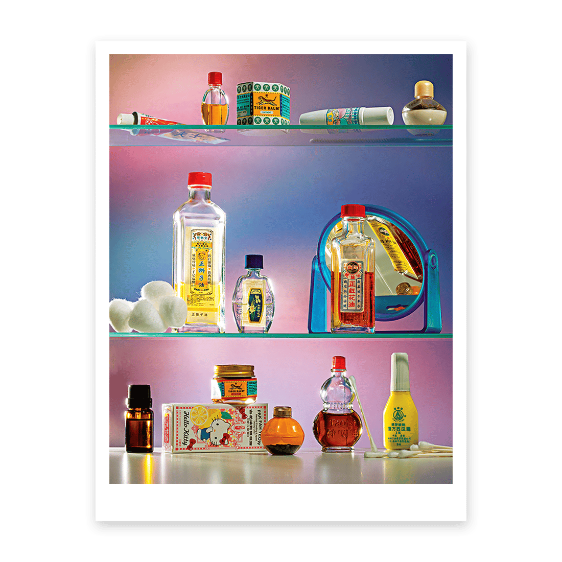A colorful print inspired by beauty and skincare product concepts of what's in our medicine cabinets, except for us it's going to be full of traditional Chinese ointments, oils, and medicinal products—the smell alone is a cure.